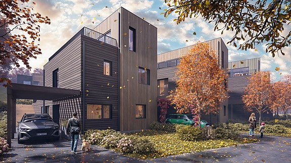 Veidebakken svinger seg slakt oppover i høyden, og her møter vi boligfeltet. Først passerer vi eneboligene - kubistiske med mørk, slank kledning. Deretter ser vi rekkehusene som med fin variasjon i høyde og farger inspirert av den omkringliggende naturen - bruntoner og grågrønt. Boligene er ment å harmonere med naturen de grenser til, og de smelter virkelig inn i terrenget. De harmonerer også med hverandre gjennom likhetene. Samtidig gir en rekke variasjoner egenart til den enkelte bolig.