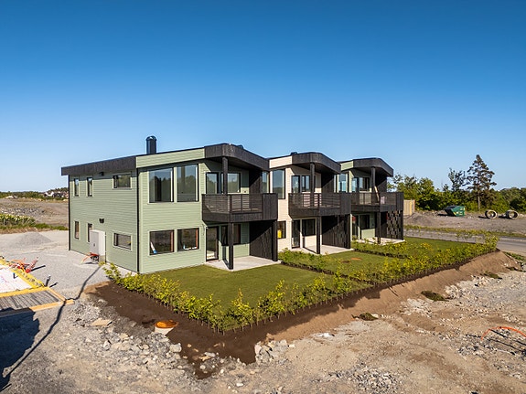 Tomten leveres ferdig planert med stedlige masser, jord og det sås plen på fremsiden. Mellom enhetene