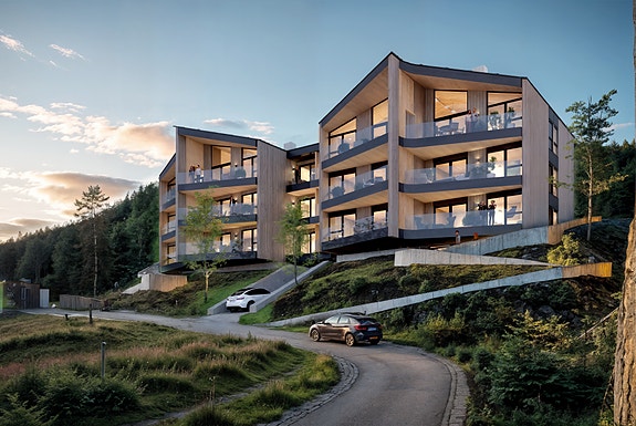 Moderne utsiktsleiligheter med terrasse, heis, peis, garasje, og gode solforhold. Nært Stryn sentrum