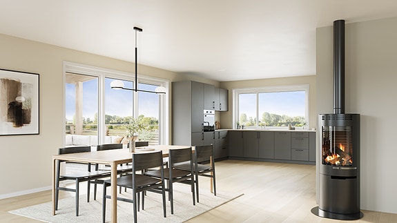 Det leveres frittstående peisovn med stålpipe i stuen.