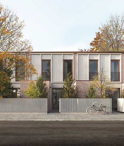 Boligene har inngang fra gaten med private forhager med plass til sykkelparkering og barnevogn, og på baksiden privat hage inn mot den store felleshagen. Kun ment som illustrasjon.