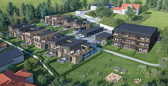 i Haugsbygd i Hønefoss skal det bygges 10 eneboliger hvor to og to er kjedet sammen med en carport mellom enhetene. Boligene er fordelt på to rekker med henholdsvis 4 og 6 boliger.
