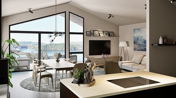 Boligene vil få gode gjennomgående kvaliteter, stor oppholdsrom og takhøyde på over 3,4 meter i stue. 3D illustrasjon, - avvik vil forekomme
