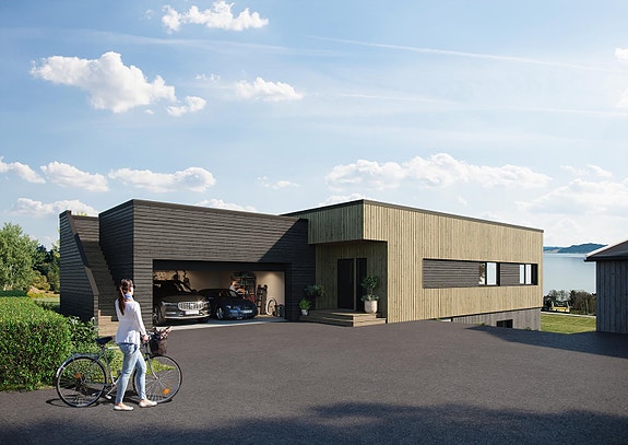 Prosjektert enebolig med dobbeltgarasje i moderne utførelse og flotte materialvalg.