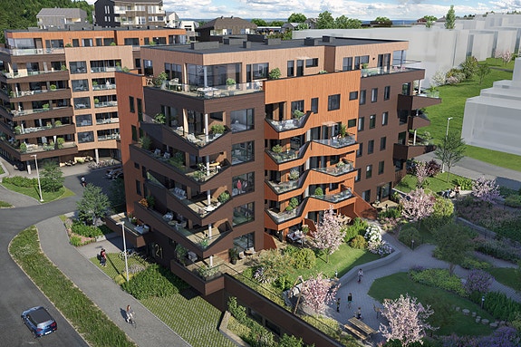 Dette blir den midterste av de tre blokkene som skal komme langs med Kjeldsbergring . Denne blokken er en etasje høyere en den siste . så Leiligheter i 6 får særdeles fri utsikt !