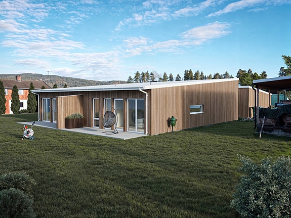 Her skal det bygges en innholdsrik tomannsbolig i moderne stil med enheter på 77 kvm BRA-i.