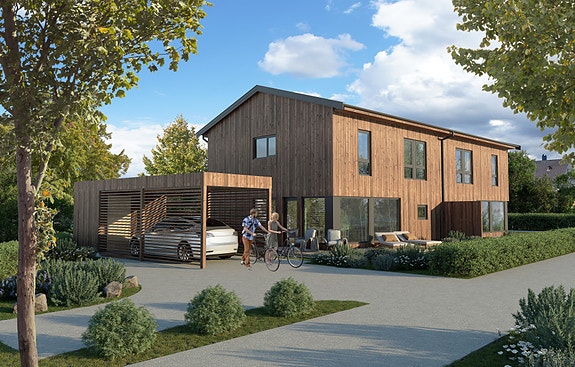 Boligene er utviklet i samarbeid med Vårdal arkitekter/ Flexibo, og med bruksareal på 127 m2 + egen carport og 5 m2 sportsbod, er dette en meget arealeffektiv bolig som dekker de fleste behov. Inngangspartiet er plassert på baksiden av boligen og har god avsatt plass til eventuell garderobeløsning. Fra gang/ hall er det direkte tilgang til bad og separat vaskerom. Vaskerommet fungerer også som teknisk rom, hvor varmtvannsbereder, sentral for vannbåren varme, ventilasjonsanlegg, rørskap og el.skap er plassert. Videre finner man stue/kjøkken plassert på grunnplan, med direkte tilgang til privat hage/ uteområde.