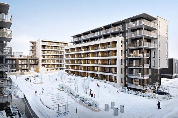 bestå av 604 leiligheter og noe næringsarealer i gateplan