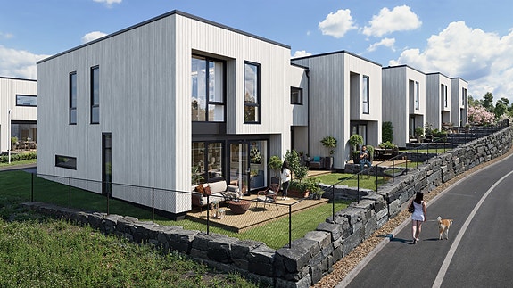 Størrelser og typer varierer, og vi tror og håper mange vil finne noe de liker. Felles er at RAMP Arkitekter har tegnet hjem som er fine å se på og gode å bo i. Totalt vil utbyggingen telle 40 leiligheter, 29 rekkehus, 10 vertikaldelte boliger og 2 eneboliger.