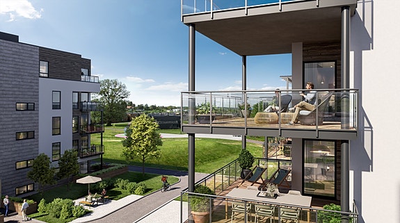 STORE balkonger i alle leiligheter. Eksteriør og fasade fra Mistelpark (Illustrasjon. Feil kan forekomme)