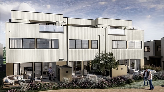 Boligene har entré med naturlig plass til garderobe, to soverom, bad, separat vaskerom og stue- og kjøkkenrom. Fra stue er det utgang til romslig terrasse med en praktisk bod som også skjermer mot den helt sikkert hyggelige naboen. Uteplassen vender mot sør-vest, noe som både gir mange soltimer og hyggelig sikt mot grønne fellesområder. Endeleilighetene er et hakk større enn boligen i midten.