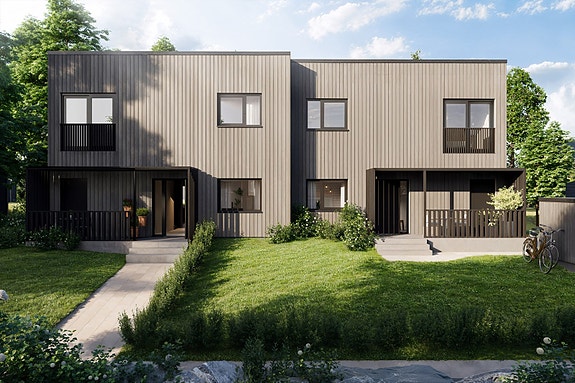Du møter en moderne tomannsbolig med tidløs utforming. Hovedformen er to kasser forskjøvet i forhold til hverandre. Langsiden er helt rett, og østveggen like rett, men får et stilig, vinfang i mørkebrune spiler som åpner opp formen og skaper et lunt uterom i tillegg å ramme inn entréen. På vestsiden brytes kasseformen opp av inntrukket balkong og inntrukket fasade under denne der terrassen ligger. Den enkle formen kles i stående, smal kledning av typen Møre Royal - lasert varmgrå så den glir diskret inn i naturen. Spilevegger, karmer og rekkverk får en brunsort overflate som står i tiltalende kontrast til det lysere treverket. Mens boligkroppen retter tankene mot funksjonalismen, har overflatene en fot i det moderne og økologiske - med respekt for materialer og natur.