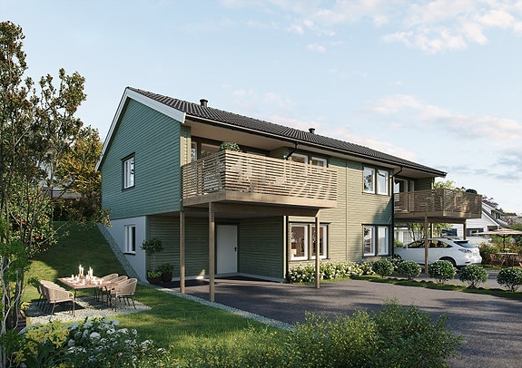 1 solgt - Byggestart! Moderne prosjektert tomannsbolig over to etasjer med tre sov, carport og flotte uteområder!