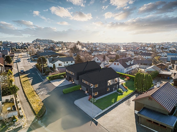 Boligene kommer med moderne og innholdsrike løsninger hvor første etasje inneholder romslig stue/kjøkken, hovedsoverom med bad og walk-in closet, og et ekstra soverom eller TV-stue. Fra stuen får du utgang til hagen hvor det bygges en flott platting for de ekstra fine dagene. Fasadene blir kledd med kledning i sort farge.