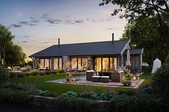 Boligen bygges med såle på grunn, 600 cm ringmur, 35 cm isolasjon i grunn og radonsperre. Selve boligen er et precut byggesett. Utvendig blir boligen kledd med liggende dobbelfalsets behandlet panel fra Bergene Holm. Svarte vinduer . Ytterdør av typen Odda i fargen svart. Himling mot kaldtloft. Taket tekkes med svart takstein . Veggene isoleres med 20cm, mens taket isoleres med 35 cm.