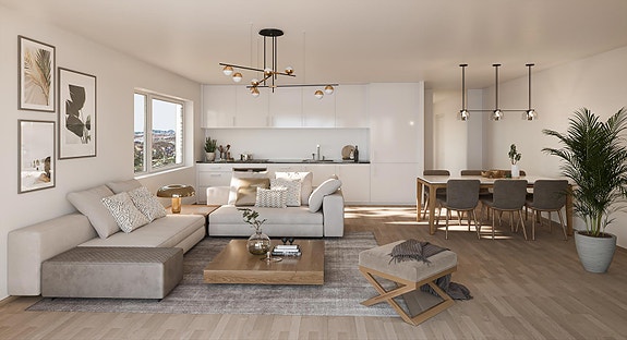 Det er NIBE varmeanlegg som varmer opp leilighetene. Ellers er det varmekabler i gulv i 1 etasje. Bildet er kun ment som illustrasjon.
