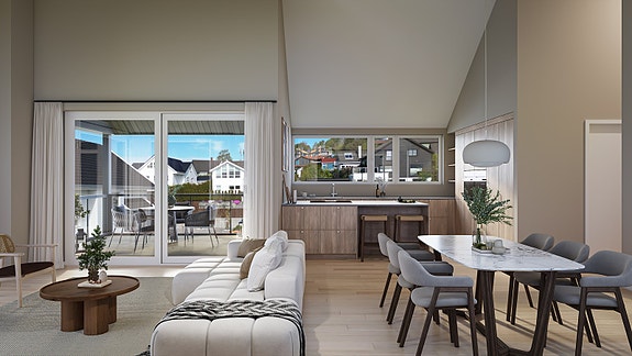 Boligen vil få nydelig utsikt til fjord og fjell fra 2.etasje og med meget gode solforhold. Her har du også en svært romslig balkong på 14 m2 med mulighet for innglasset hagestue (tilvalg). Her kan du virkelig nyte lange kvelder.