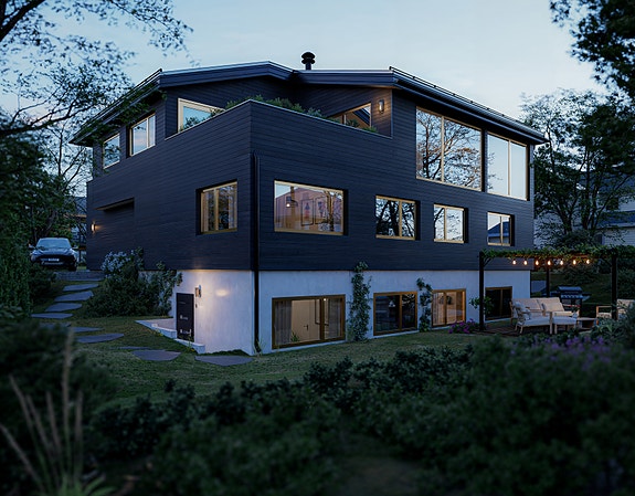 Eiendommen har dobbelgarasje med elbillader og en flott hage. Boligens nydelige og moderne fasade gir et eksklusivt inntrykk. Kledningen på boligen leveres i MøreRoyal sort.