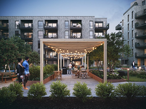 Bakhagen blir pent beplantet, og leveres med bla. stor pergola og hyggelige sittegrupper. Bildet er en 3D illustrasjon - og avvik vil forekomme.