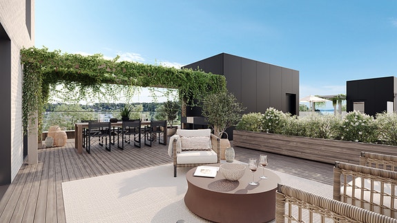 Leilighetene ligger på toppen av borettslaget, og har alle privat takterrasse med utekjøkken.