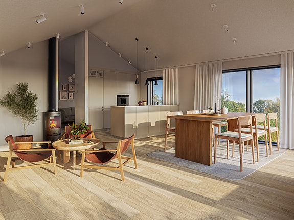 - Åpen stue- og kjøkkenløsning med god takhøyde og lysinnslipp