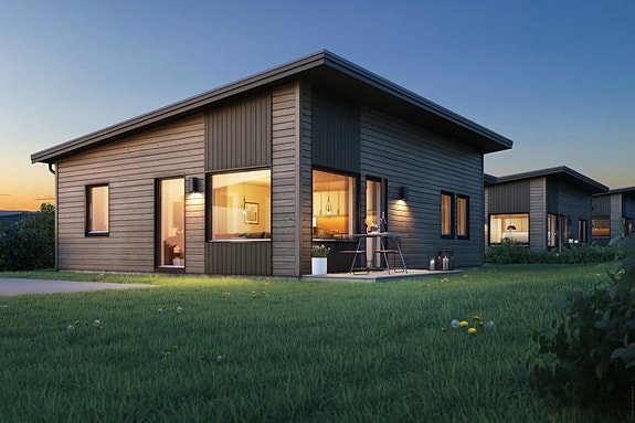 Alle yttervegger leveres som isolert bindingsverksvegg med utvendig kledning og innside med gips som standard