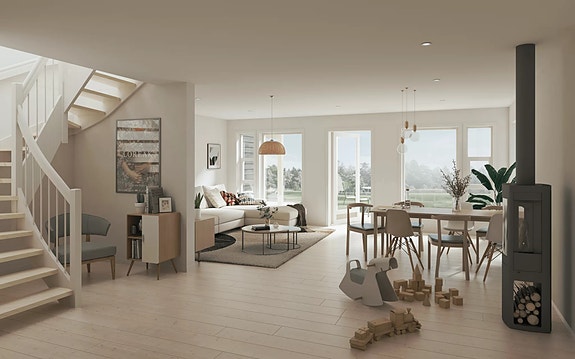 Det er gode planløsninger og kvaliteter på leveransen, med blant kjøkkeninnredning fra HTH med integrerte hvitevarer, listefrie løsninger og enstavs eikeparkett.