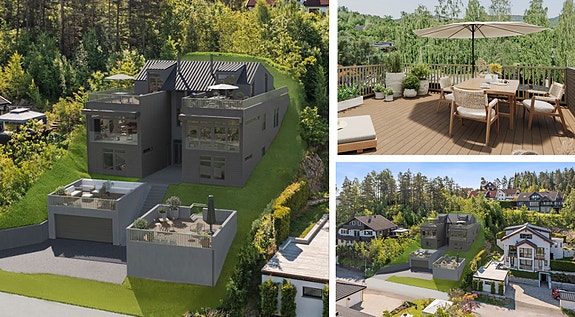 Tomannsbolig under oppføring med familievennlig planløsning og beliggenhet. Bildet viser elementer og materialer som ikke er en del av standard leveransen.Det vil være synlig betong på siden av boligen. Bildet er kun ment som en illustrasjon.