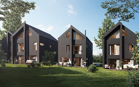 - Det tas forbehold om at illustrasjoner i tegninger og 3D i annonsen er kun ment som eksempler og kan vise forhold som ikke er i samsvar med leveranse. Dette kan være møblering, fargevalg, dør- og vindusform, antall vinduer, bygningsmessige detaljer, for eksempel fasadedetaljer, manglende inntegning av sjakter/innkassinger/rørføringer/dragere/søyler, detaljer på fellesarealer, detaljer på lekeapparater, materialvalg, beplantning etc. Omgivelsene rundt husene er manipulert.