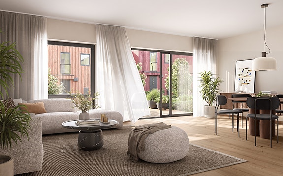 Stuene i bygg 6 vil bli luftige og lyse med store vindusflater og åpen løsning mot kjøkken. Det kan være avvik mellom illustrasjon og leveranse.
