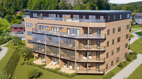 Bygget har et moderne uttrykk med kombinasjon av tre og platekledning, rause vindusflater og private balkonger/terrasser perfekte uteplasser for å nyte solen.