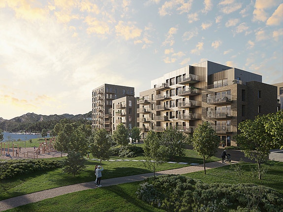 Velkommen til Sementen - 33 leiligheter og 6 etasjer på det høyeste. Merk at illustrasjonen kan vise elementer og materialer som ikke er en del av standardleveransen. Avvik vil forekomme.