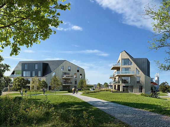 Utsikten er tegnget av Eder Biesel Arkitekter. Her er hus A og B sett fra nordøst.