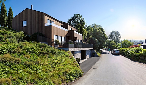 Utvendig kledning leveres av Bergene Holm AS i typen ÆDEL en eksklusiv grankledning i fargen Ædelbrun. Lys, behandlet med ett strøk vanntynnbar alkyd-/akrylgrunning og ett strøk polyuretanforsterket, halvblank akrylbeis fra Teknos. Grunningen beskytter overflaten mot sopp og råte, mens beisen gir et transparent uttrykk som fremhever treets naturlige struktur. ÆDEL leveres ferdig behandlet på tre sider, samtidig som den har lang levetid. Kledningen monteres som stående trepanel med synlige spikerhull.