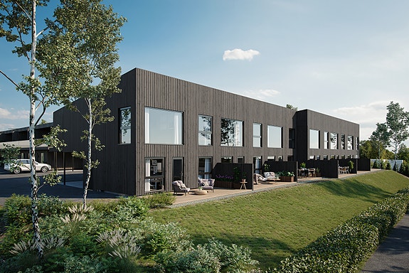 Illustrasjonen her viser fasaden sett fra Gulsetsenteret. Bolig nr. 6 nærmest.
