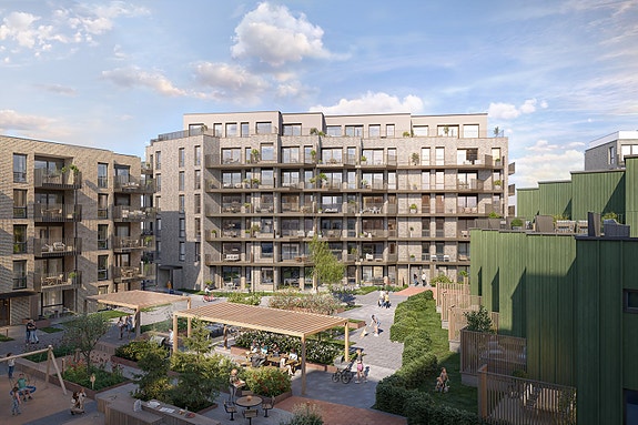 Flotte teglfasader vendt mot sørvest og inn mot den urbane byhagen. Bildet er en 3dillustrasjon og vil avvike.