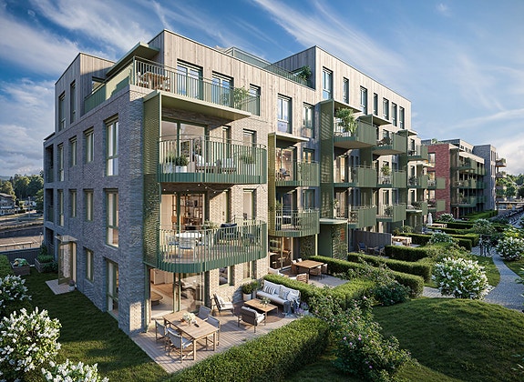 25 nye selveierleiligheter for salg! Vestvendte balkonger inn mot frodig, rolig hage. Nye E18 i tunnel.