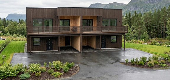 4 stk moderne 2 mannsboliger med Møre Royalkledning, 3 soverom, 2 bad, terrasse, carport og flott utsikt mot Vengetind