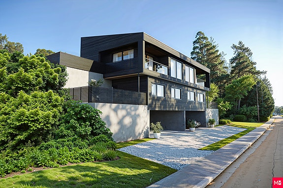 På en sørvendt tomt i Harald Skjolds veg planlegges oppføring av en stilren, vertikaltdelt tomannsbolig med integrert carport, romslige terrasser og takterrasser. Boligen har en tiltalende arkitektonisk utforming som kombinerer funksjonalitet med estetikk, og fremstår som et moderne og innbydende hjem.