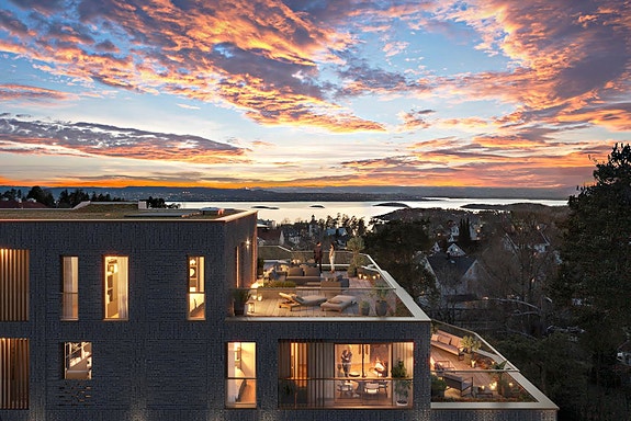 A-lab arkitekter har tegnet et klassisk og vakkert teglhus. Nydelige ornamenter i fasaden gir huset et særpreg, og den robuste teglen blir en fin kontrast til omramminger i treverk og gyllent metall. Leilighetene blir romslige, fra omkring 74 til 152 kvadratmeter store, med bokvaliteter som vi vet at mange ønsker seg. Det blir parkeringsplasser i kjelleren, heis til alle etasjer og vannbåren gulvvarme. Alle leilighetene vender mot utsikten i vest, og får en romslig og solrik uteplass. Innvendig vil det bli lyst og luftig, med god takhøyde og store vindusflater som rammer inn den vakre utsikten. Det vil innredes med eksklusive gulv, kvalitetskjøkken, lune farger og god standard på alle detaljer.