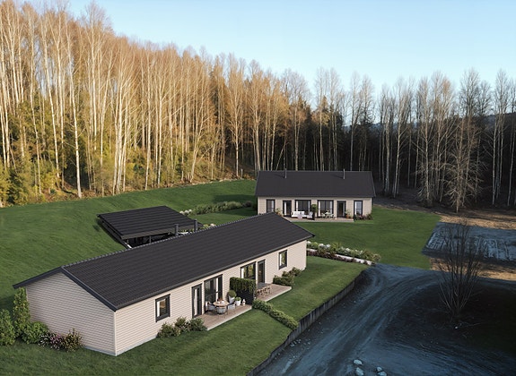 Takkonstruksjon utføres med W-takstoler, diffusjonsåpent undertak og sort glatt takstein. Takrenner, nedløp, beslag og snøfangere leveres i sort utførelse.