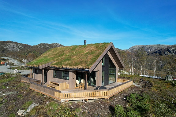 Alle hyttene leveres med "torv" på taket, noe som gjør at hyttefeltet glir fint inn i terrenget.
