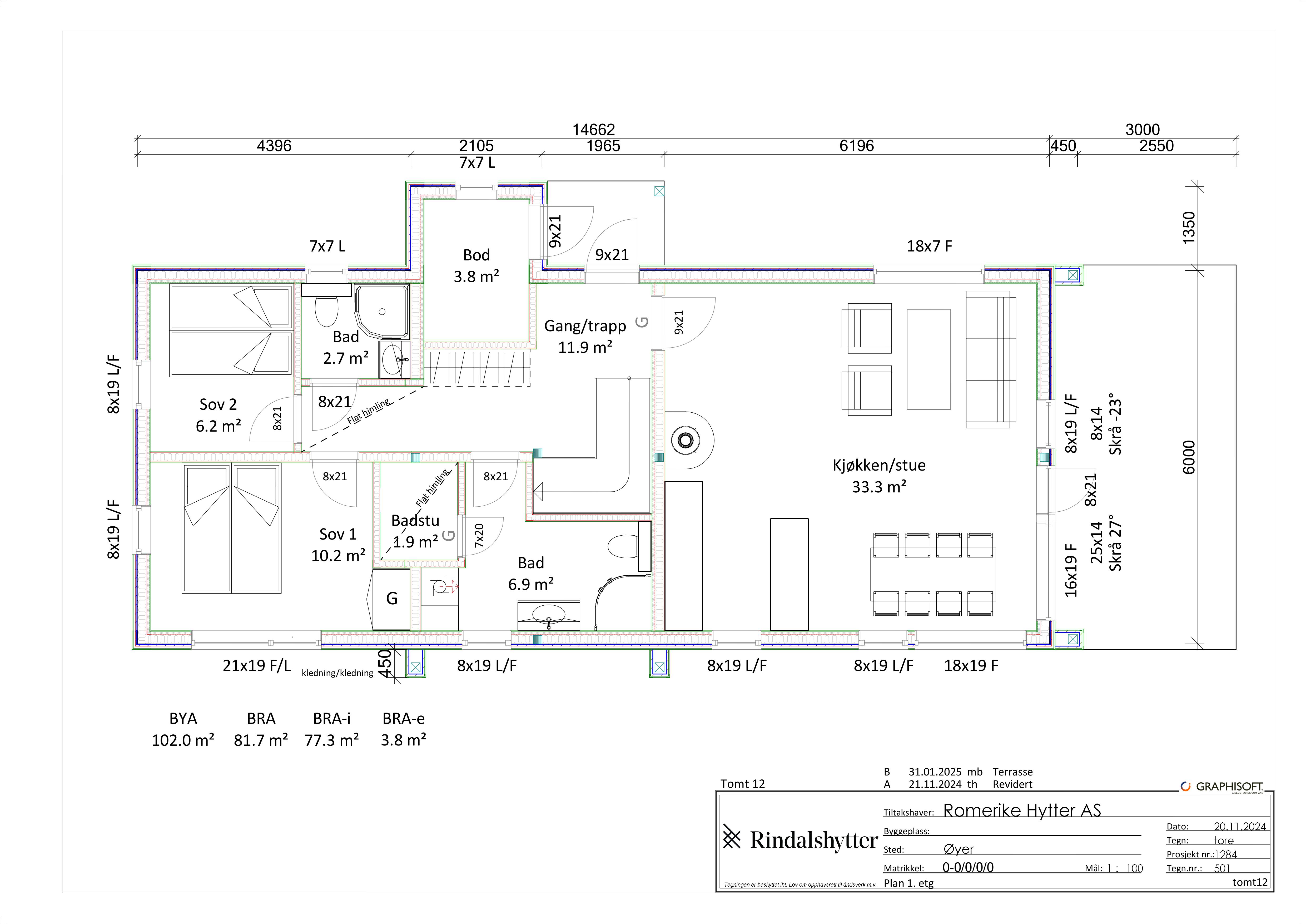 Det kan forekomme avvik mellom byggebeskrivelse og plantegninger. I slike tilfeller er det alltid byggebeskrivelse som er retningsgivende. Enkelte illustrasjoner i tegningsmaterialet kan vise forhold som ikke er i samsvar med leveranse, så som møblering, fargevalg, gulv, dør- og vindusform og bygningsmessige detaljer. Videre kan vindusplassering avvike noe fra de generelle planer, som følge av bl.a. den videre arkitektoniske detaljutformingen av bygget. Detaljprosjektering av tekniske føringer og installasjoner kan medføre mindre endringer som for eksempel en nedforing kasse for avløp.