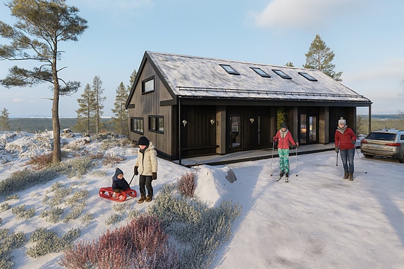 - Hyttene bygges med precut-elementer og robuste takstoler fra Optimera – for presisjon, styrke og effektiv montasje.