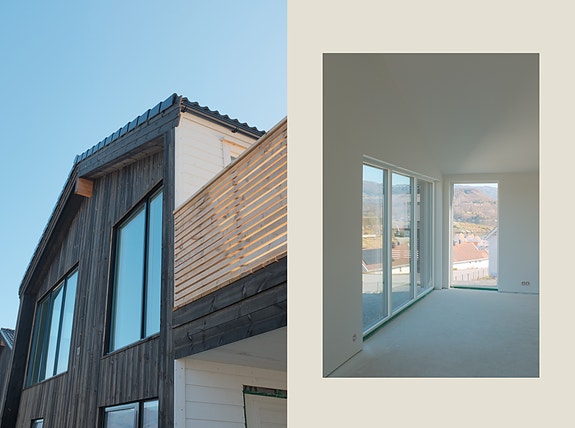 Moderne og stilfull bolig. Boligen har stramme linjer og en fasade som brytes opp i vertikal og horisontal kledning.