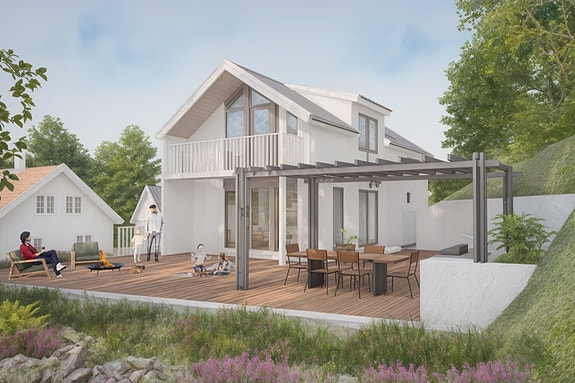 Annonsert pris for boligen gjelder kun selve boligen. Illustrert anneks, terrasser, trapper, pergola osv. er forslag for å illustrere muligheter på tomten.