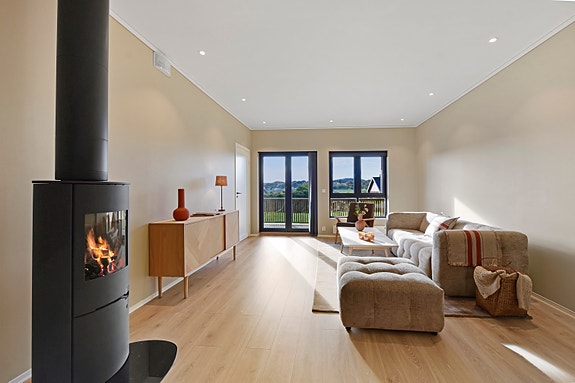 Boligen har integrerte kjøkken med alle hvitevarer, flislagt bad og entre` med varmekabler, fine ute arealer, mark-terrasse på 18 kvm og moderne farger. Det er stålpipe og koselig vedovn.