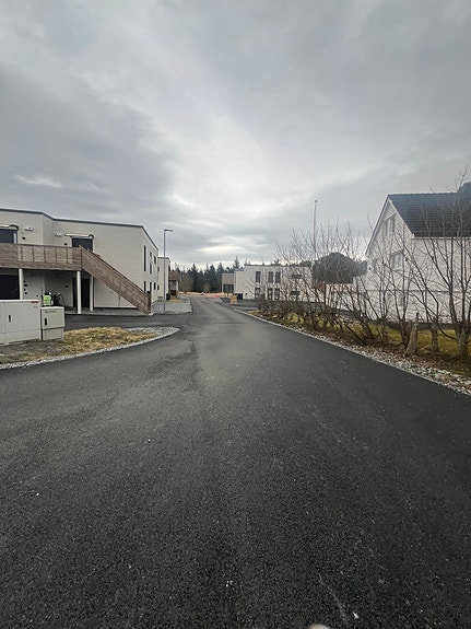 Felles privat veg med gatelys er etablert. Vegen mangler asfalt, men det vil bli asfaltert når husene har kommet opp og feltet er ferdig.