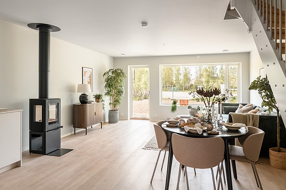 Boligene får stue og kjøkken i åpen løsning i første etasje - et lyst og tiltalende allrom som passer perfekt til både hverdag og fest. Rommet får enstavs laminatgulv med lun gulvvarm, og det monteres en stemningsfull peisovn fra Peisselskabet (type VisionLine BLK 100 eller tilsvarende). Store vinduer vil gi rikelig med lys på dagtid, og det er i tillegg utgang til uteplass.