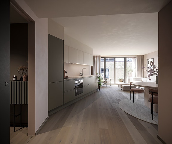 Leilighetene får et moderne interiør med helhetlig design og industrielt preg. Illustrasjonsbilde fra leilighet A0406.